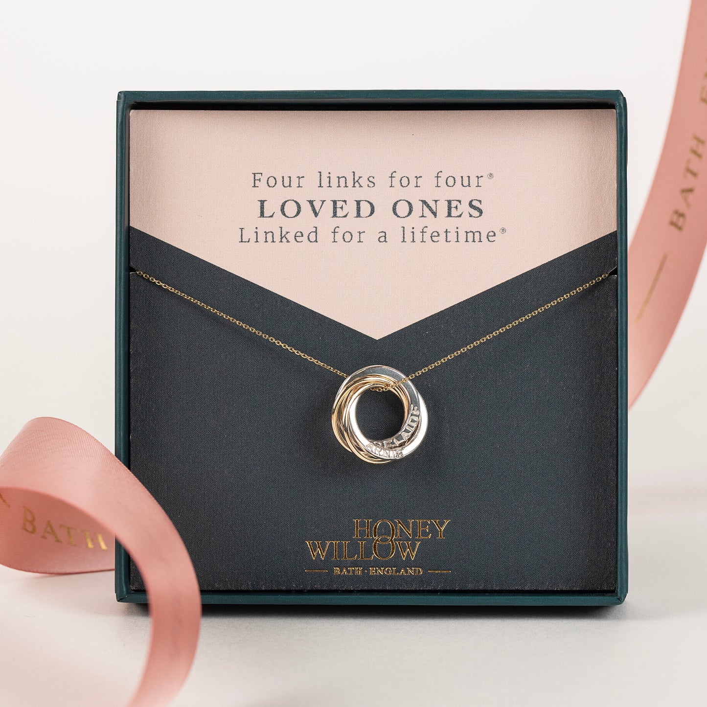 Give her a four links for four® loved ones necklace, designed and handmade in Bath, England. Honey Willow is a family business, founded in 2010.