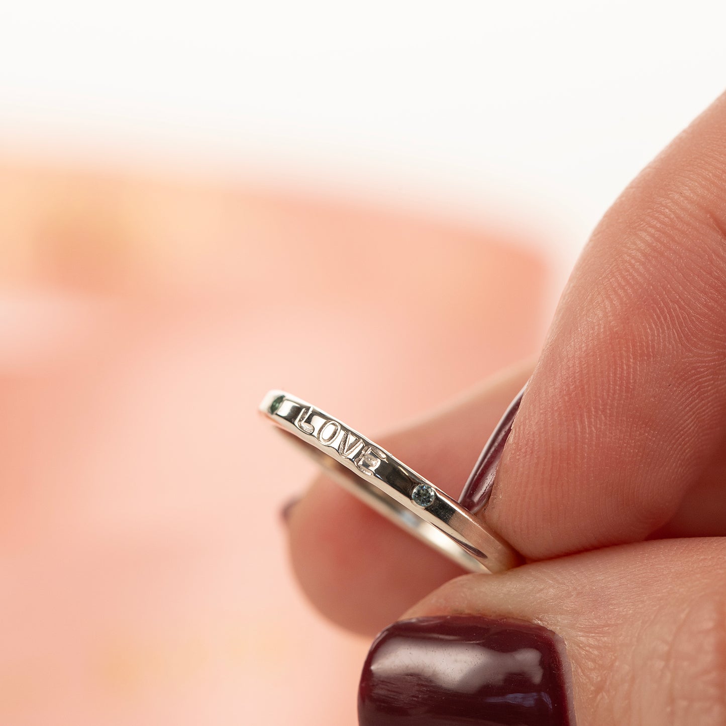 We hand stamp the ring with up to 10 characters.