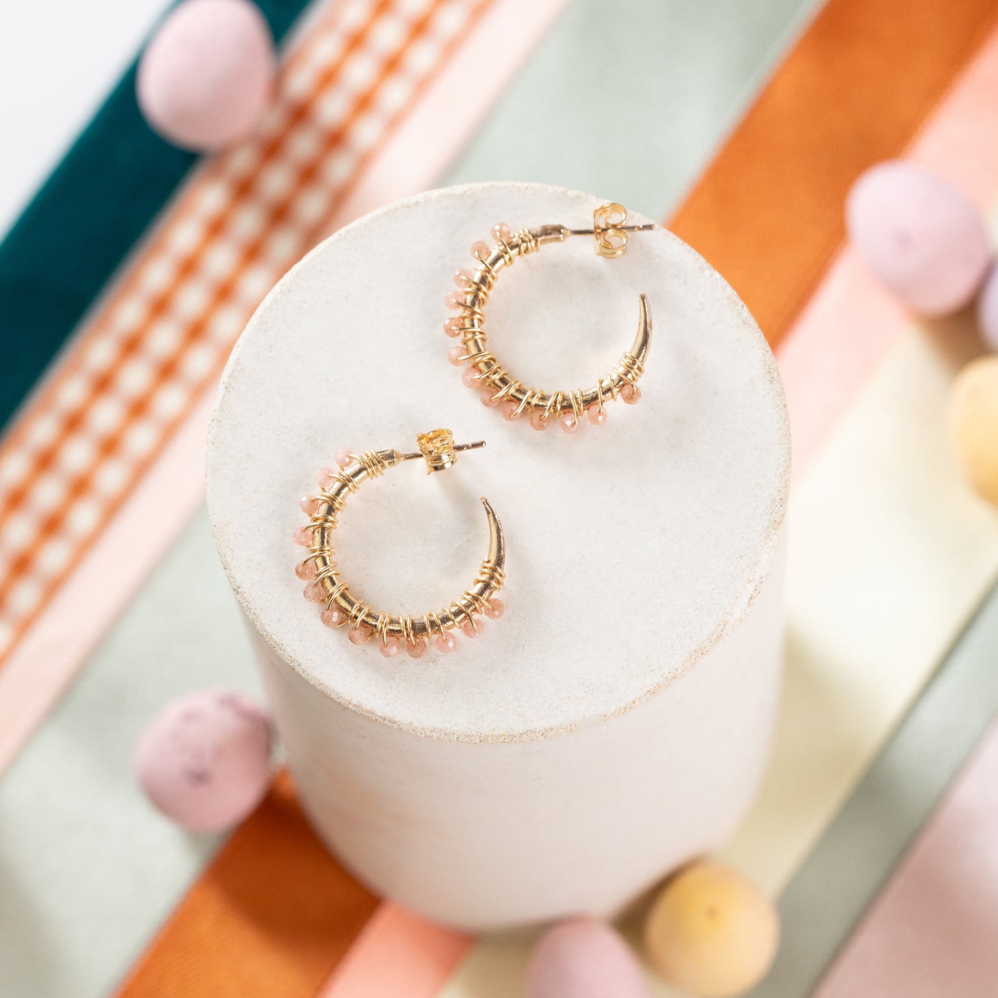 These gemstone hoop earrings are handmade with either sterling silver or 14k gold-fill and tiny coral-pink rhodochrosite stones.