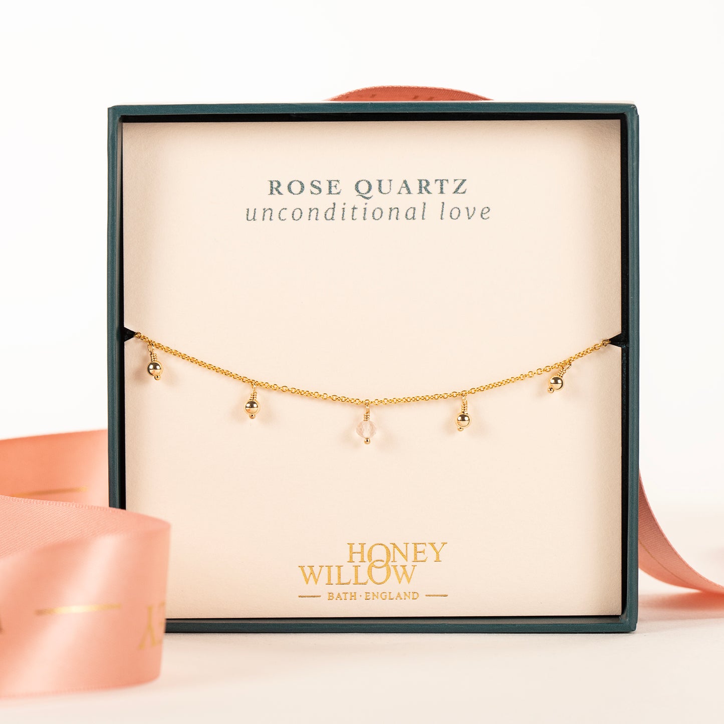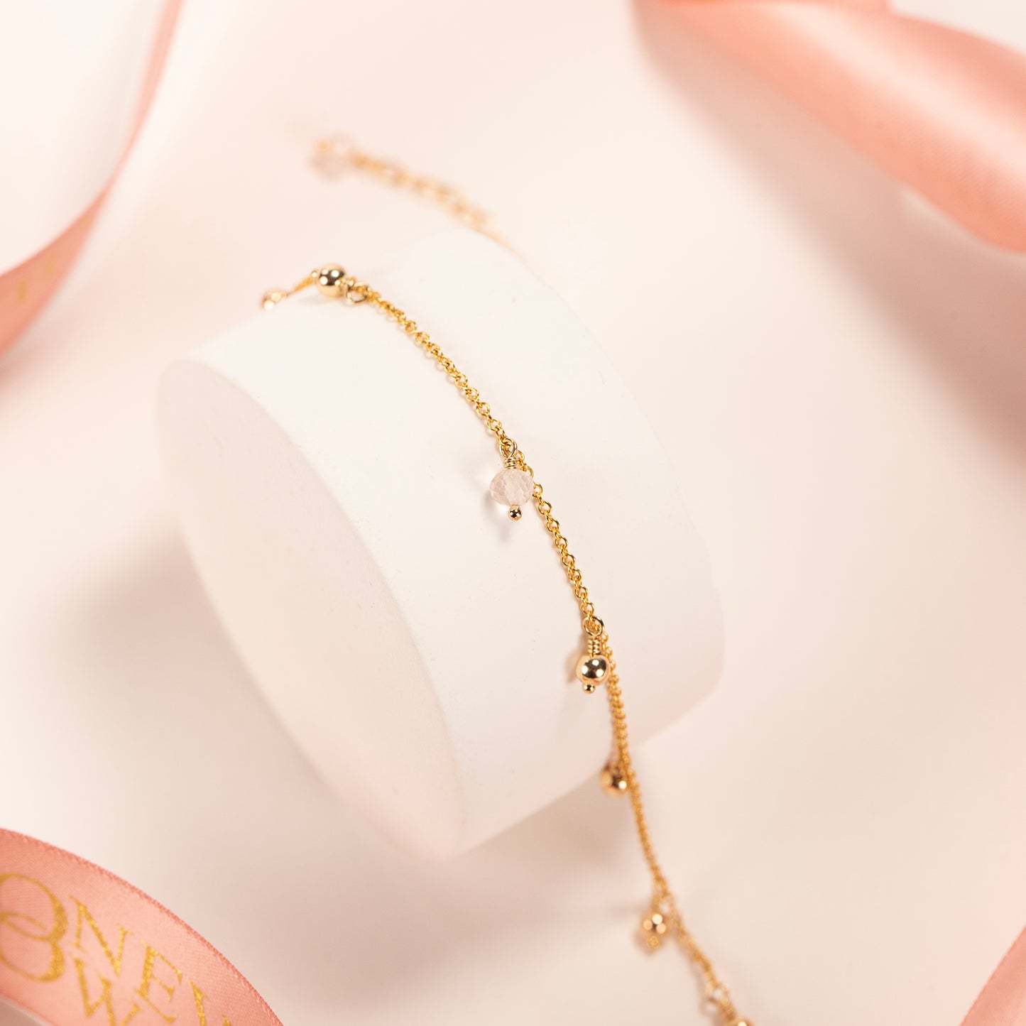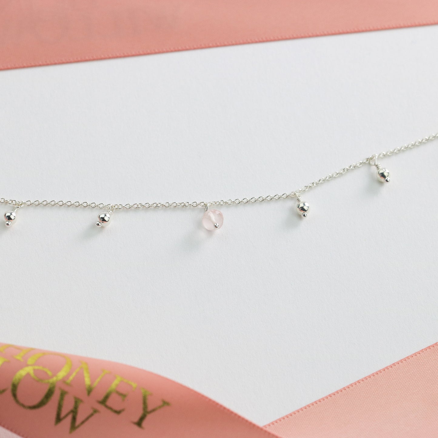 This delicate bracelet is handmade with either sterling silver or 14k gold-fill and a rose quartz stone.