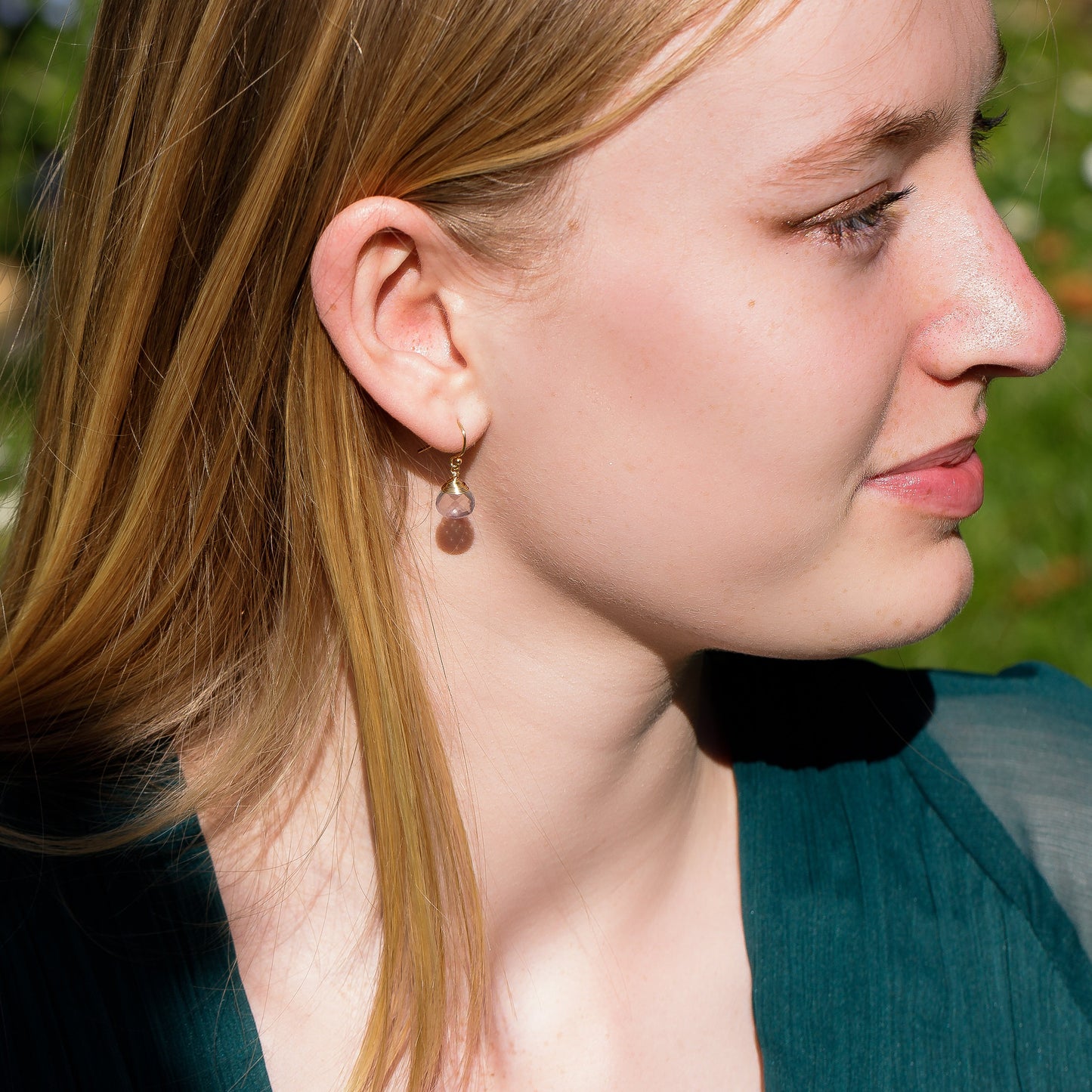 These dainty drop earrings are handmade with wire-wrapped rose quartz briolettes.