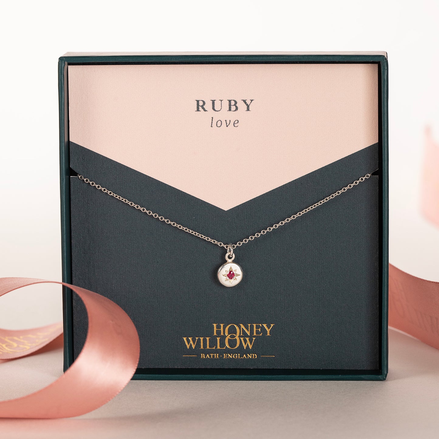 Show your love for her with a dainty sterling silver pendant, star-set with a tiny ruby, which symbolises love.