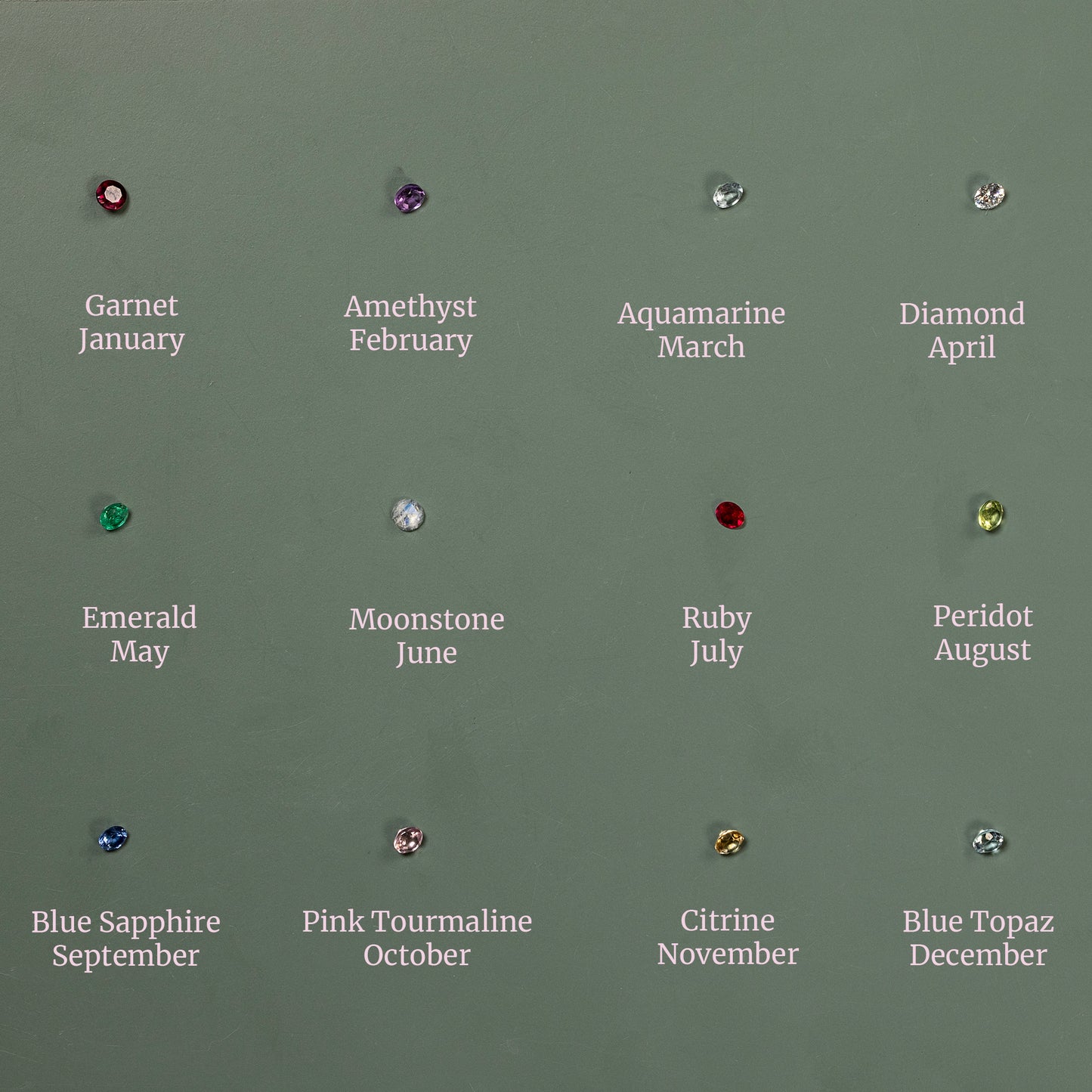 Image 2 shows the birthstones we use. Please note that the diamond is lab-grown. A lab-grown diamond is made from the same material as a mined diamond, without the ethical and environmental problems. The stone is 3mm in diameter.