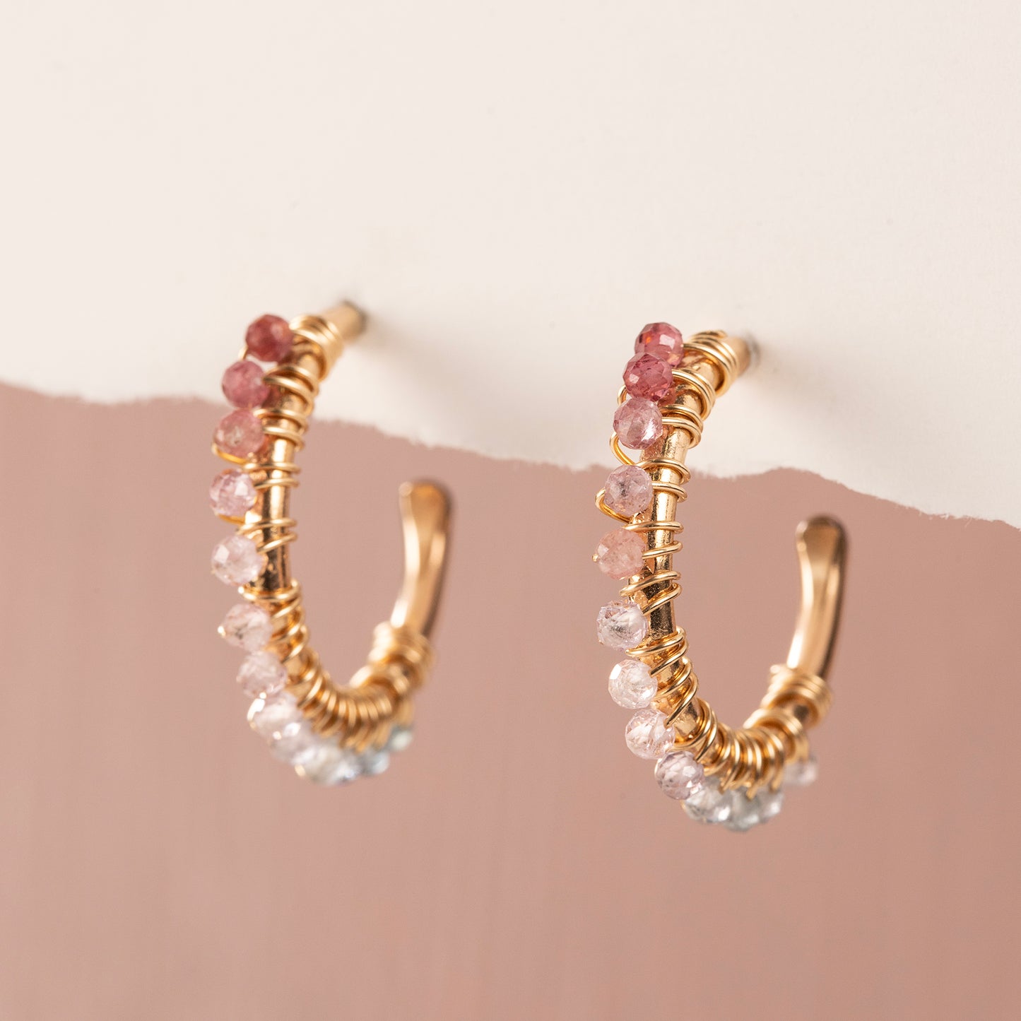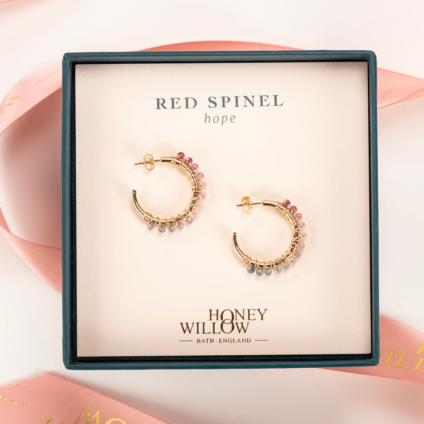Give her a meaningful gift that celebrates and inspires her.  These gemstone hoop earrings are handmade with either sterling silver or 14k gold-fill and tiny spinel stones, which symbolise hope, revitalisation and joy.