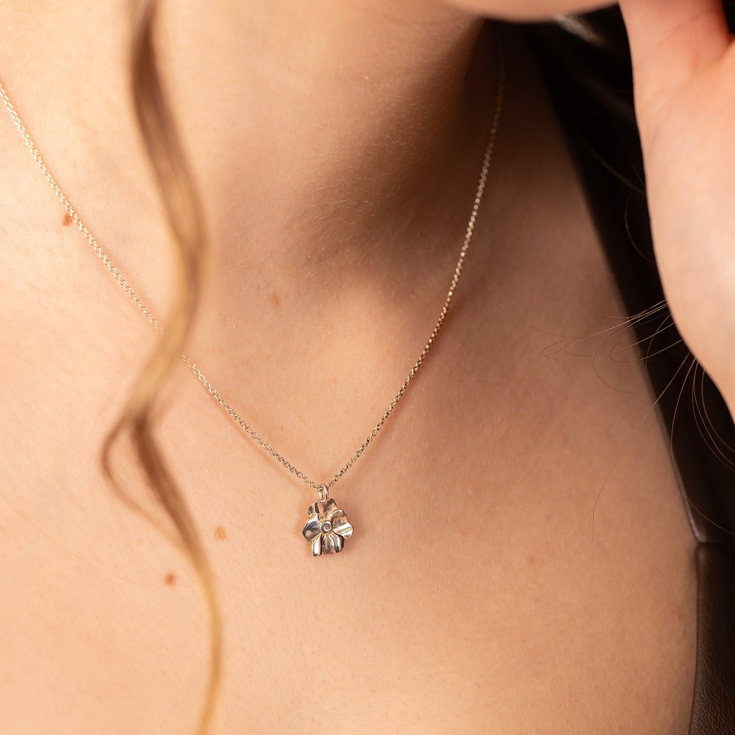 This dainty violet flower necklace is made with recycled silver.