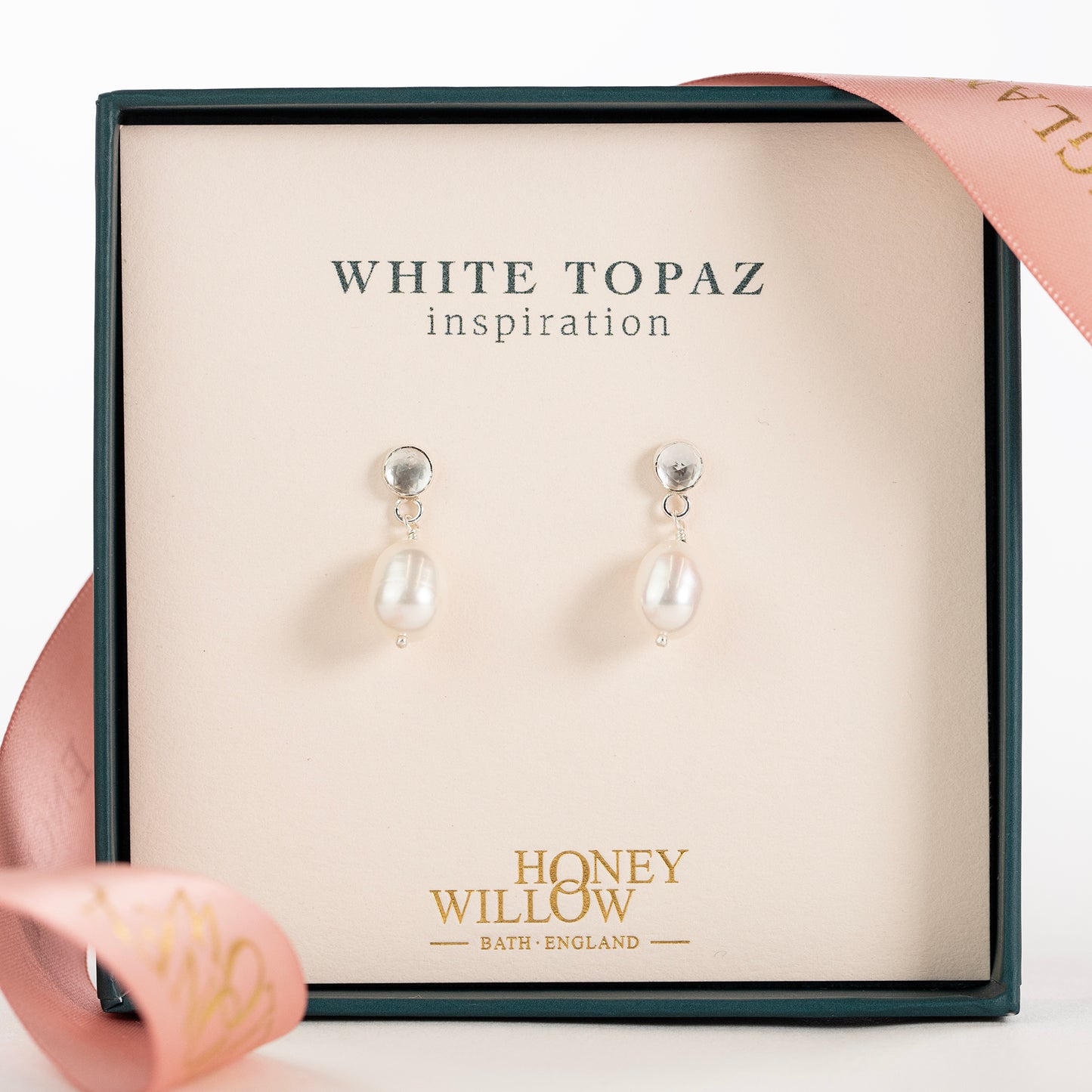 These earrings are handmade with white topaz and freshwater pearls. White topaz symbolises inspiration.