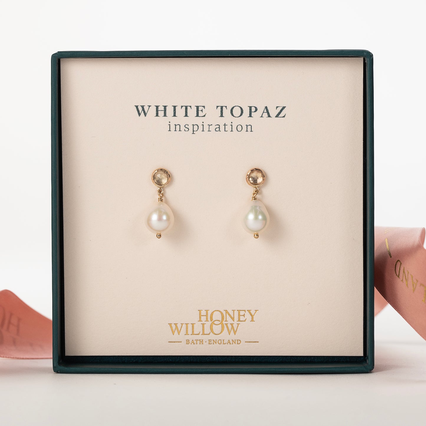 These earrings are handmade with white topaz stones, freshwater pearls and either sterling silver or 14k gold-fill. White topaz is a clear stone, which will take on the colour of the metal in its setting.